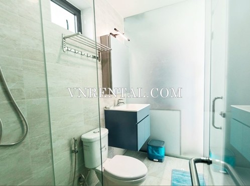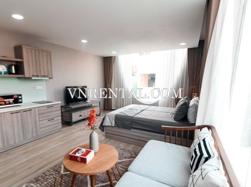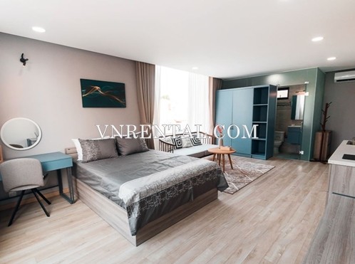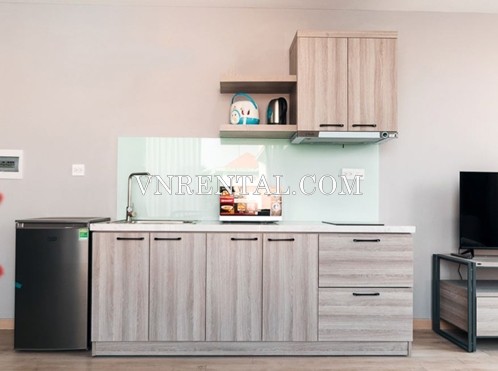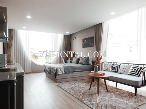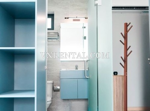 This 34 sqm studio for rent located near Phan Dang Luu street, Binh Thanh district, HCMC, with spacious and airy room. The studio for rent has been designed with two colors of light gray – light blue make the place more spacious and luxury. The couch with smooth seat cushion is placed close to the window to create a relaxing corner to look at the surrounding fig is quite ideal. The kitchen has been prepared beaitifully with all necessary equipments for cooking nice meals.