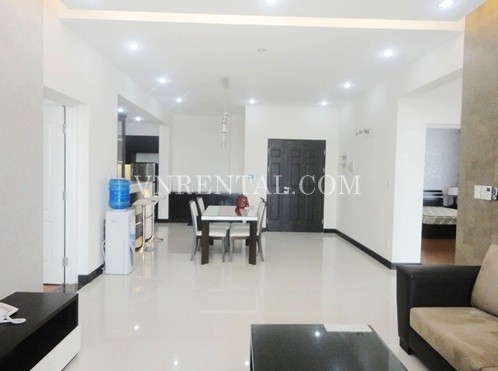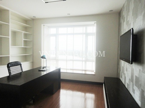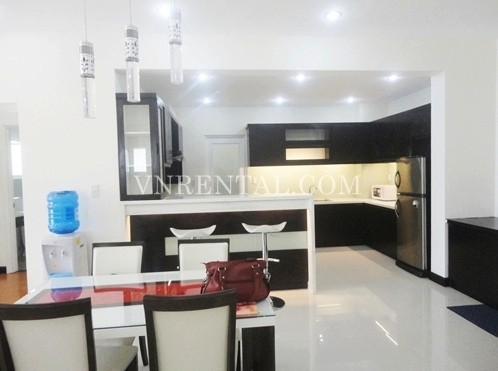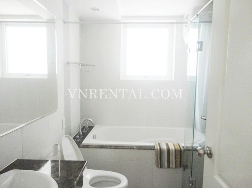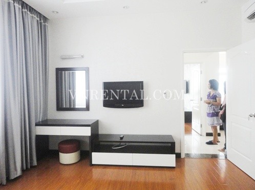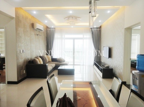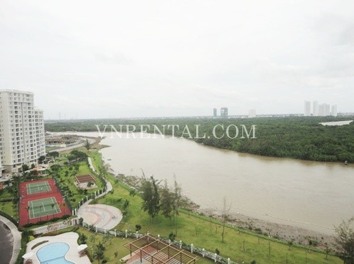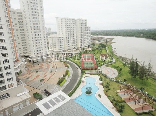 Apartment for rent in Riverside Tower, District 7, HCM City. Apartment has a living room, 3 bedrooms and 3 bathrooms and kitchen, usable area is 150 sqm, river view, fully furnished, wooden floor and high floor. Close to RMIT University, FV Hospital, Ban Nguyet lake, park, fast food restaurant. 20 minutes to District 1 - center of HCM City.