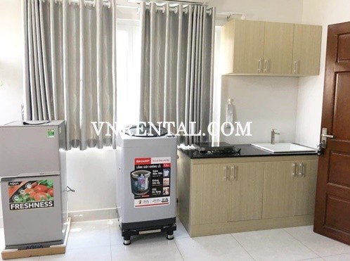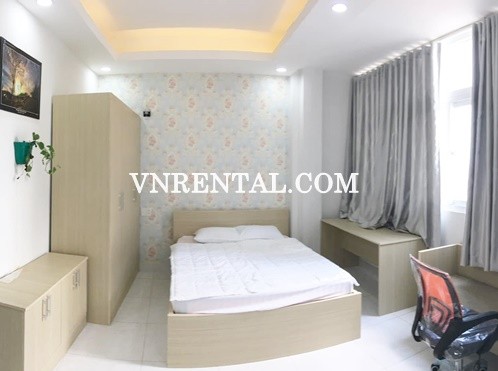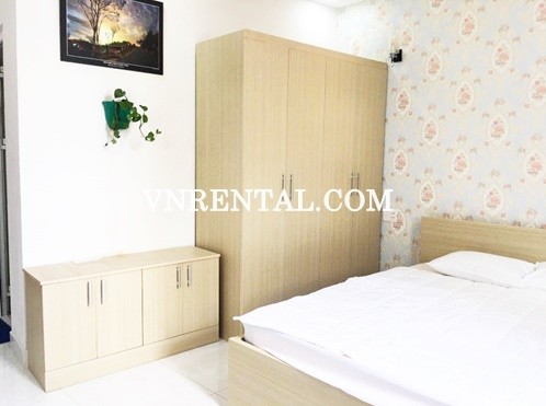 Lovely studio serviced apartment for rent on Truong Quyen Street, District 3, Ho Chi Minh City, Viet Nam. All serviced apartments are designed to provide comfort and style with personalized service and convenient aminities. Just takes only 12 minutes to go to Tan Son Nhat international airport. Suitable for tenants loving living in a quiet peaceful area but still not separated from modern crowded urban life. The unit have table to sit, chair, Desk, Bed, Air-conditioner, Fridge, A kitchen, Cabinets, Television.