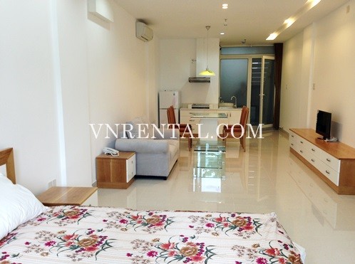 Bradnew and nice serviced apartment for rent in Nguyen Thai Binh ward, District 1, Ho Chi Minh city, Viet Nam. It is front unit with balcony.  This location is very near Ben Thanh Market and easy to reach all services such as: restaurant, hotel, shops, park, supermarket, ... It is suitable for those who work in center of District 1 and areas around. There are some options in this building price for 1-bedroom studio: 600-700-800$/month